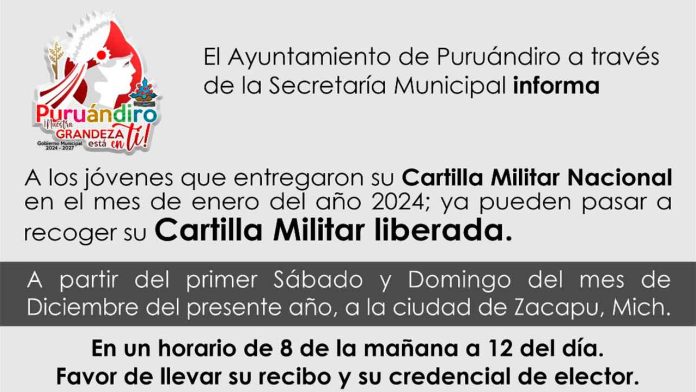 El ayuntamiento de Puruándiro, a través de la Secretaría Municipal, informa a todos los jóvenes que se estará realizando la entrega de la respectiva Cartilla Militar Nacional que solicitó en enero del 2024 ya pueden pasar a recoger su Cartilla Militar “liberada”.