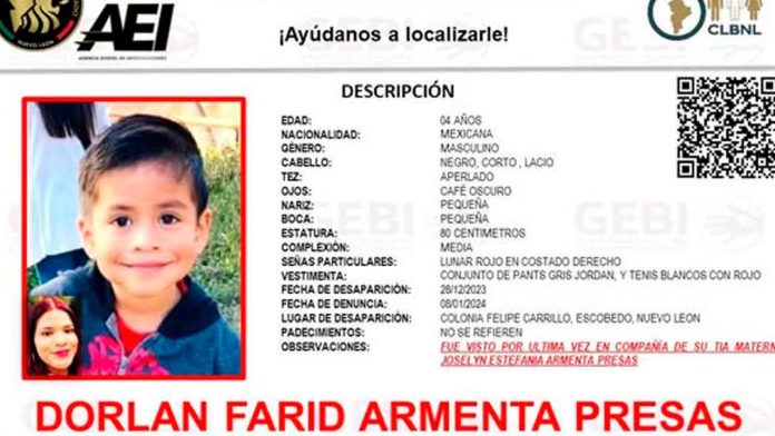 De acuerdo con la información, el pequeño Dorlan Farid fue visto por última vez con su tía, identificada como Joselyn Estefanía Armenta, hermana de su madre.