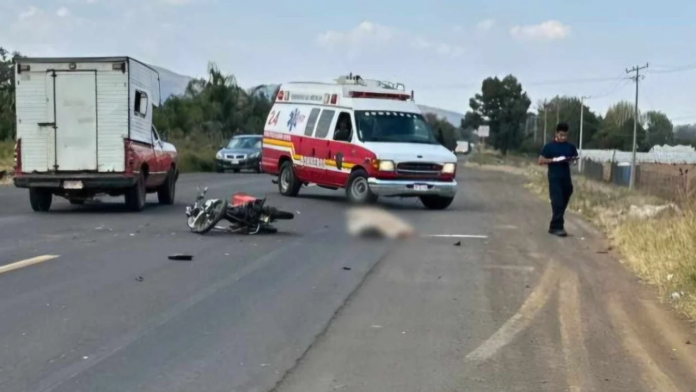 Tangancícuaro, Mich.- 04 de enero de 2025.- El conductor de una motocicleta perdió la vida de forma inmediata debido a las lesiones que sufrió al chocar contra una camioneta, cuyo conductor espero el arribo de las autoridades.