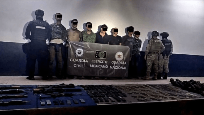 A los indiciados les fueron asegurados 7 rifles de asalto, 49 cargadores para arma larga, 1,340 cartuchos útiles, y 7 chalecos porta placas.