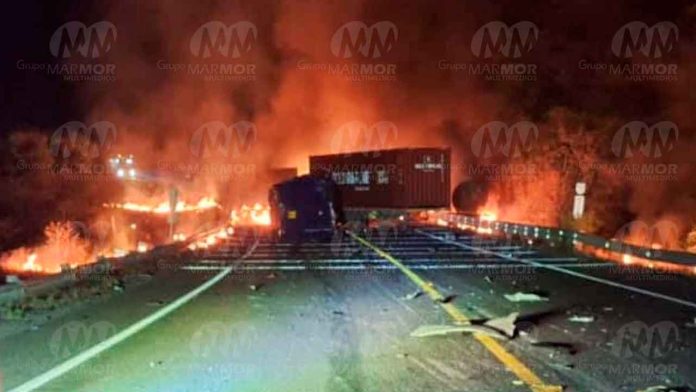 Arteaga, Mich.- 08 de enero de 2025.- La madrugada de este miércoles se registró una colisión múltiple sobre la autopista Siglo XXI, en la que se vieron involucradas dos pipas y un tráiler, unidades que tras el choque se incendiaron, con saldo preliminar de una persona sin vida.