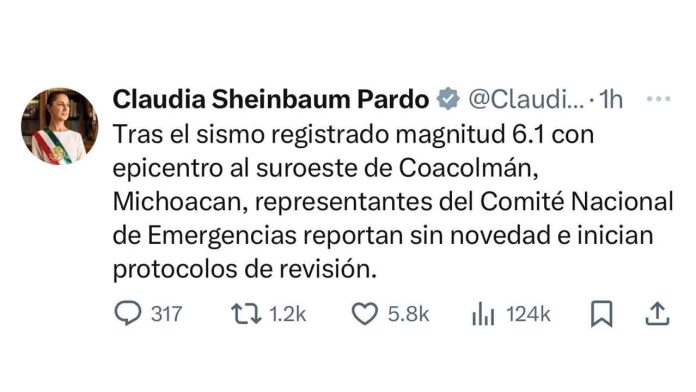 A través sus cuentas de redes sociales, la presidenta de México, Claudia Sheinbaum Pardo informó que tras el sismo de 6.1 en la escala de Richter al suroeste de Coalcomán, se le informó que no se contaba con alguna situación de riesgo o afectaciones.