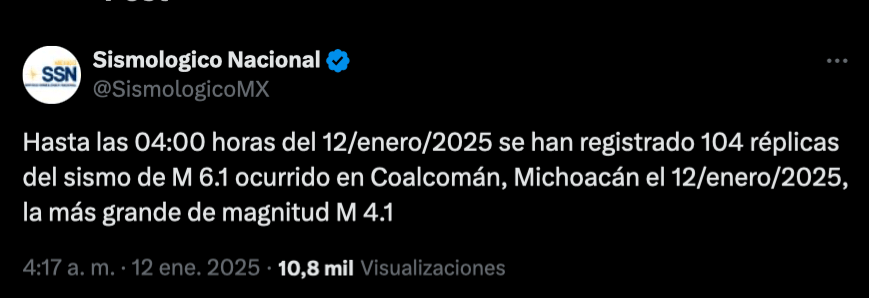 Durante la madrugada de este domingo 12 de enero el Sistema Sismológico Nacional informó sobre un sismo de 6.1 al suroeste del municipio de Coalcomán, Michoacán; a las 4 am ya se contabilizaban 104 réplicas del movimiento telúrico, de acuerdo al Sismológico.