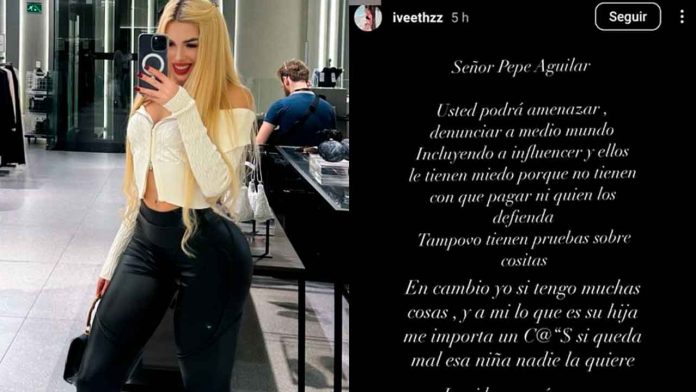 “Señor Pepe Aguilar, usted podría amenazar, denunciar a medio mundo incluyendo a influencers y ellos le tienen miedo porque no tienen con qué pagar ni quién los defienda. Tampoco tiene pruebas sobre cositas. En cambio, yo sí tengo muchas cosas, y a mí lo que es su hija me importa un C@”$ si queda mal, esa niña nadie la quiere”, escribió la influencer en sus historias de Instagram.