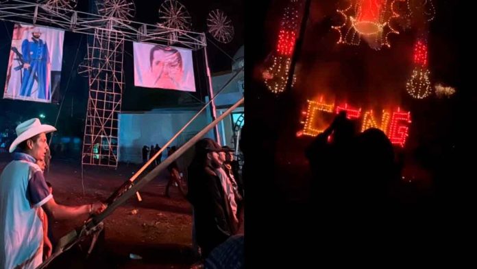 En el material se observa la quema de un castillo, con las siglas del CJNG, mientras que en el escenario fueron colocadas dos lonas de gran tamaño, una con la fotografía de Nemesio Oseguera y aparentemente de Javier Guerrero Martínez, exlíder de la célula “Los Guerreros”.