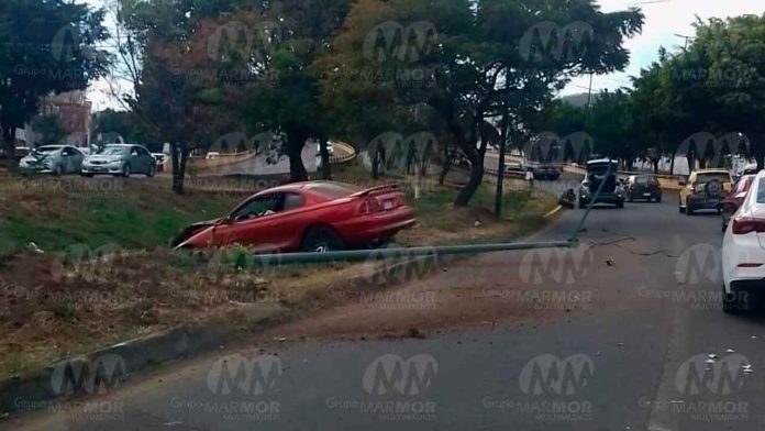 Morelia, Mich.- Viernes 17 de enero de 2025.- Un automovilista chocó contra un poste del alumbrado público ubicado en el camellón central del Periférico Paseo de la República, a la altura de la Macroplaza Estadio, en Morelia. Afortunadamente no hubo lesionados ni fallecidos, trascendió en la cobertura de la noticia.
