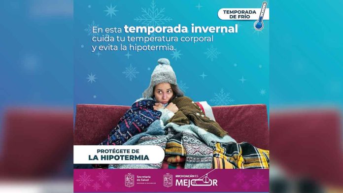 Morelia, Michoacán, 19 de enero de 2025.- La hipotermia puede provocar la disminución de la temperatura corporal por debajo de los 35 grados, aumento de frecuencia cardiaca, escalofríos, dificultad para moverse, somnolencia y confusión mental, por ello, la Secretaría de Salud de Michoacán (SSM) recomienda a la población que en esta temporada invernal se mantengan abrigados.