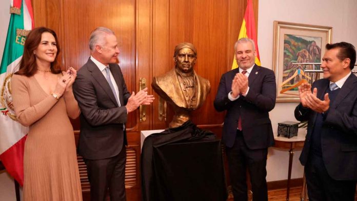 Madrid, España, 23 de enero de 2025.- El gobernador Alfredo Ramírez Bedolla y el embajador de México en España, Quirino Ordaz Coopel, develaron un busto de generalísimo José María Morelos y Pavón en las instalaciones de la embajada con el que se hace homenaje al caudillo de la insurgencia nacido en la antigua Valladolid, hoy Morelia, Michoacán.