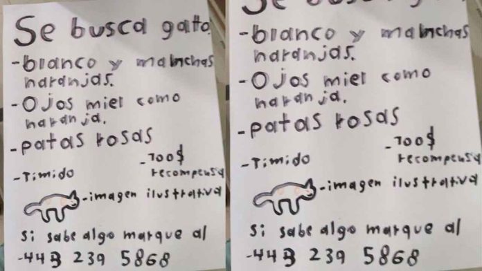 Se lee que el gato extraviado tiene ojos miel, ‘patas rosas’ y es tímido.
