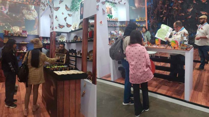 En el estand donde se encuentra la comitiva michoacana existe una cabina interactiva para que las y los turistas y visitantes se adentren a cómo son los santuarios que forman parte de la Reserva de la Biosfera de la Mariposa Monarca.