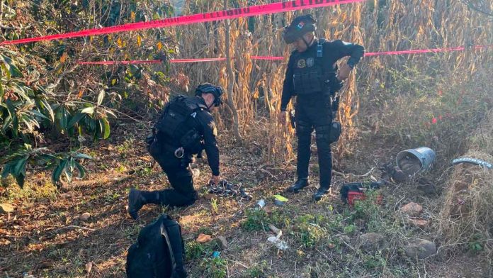 Tangamandapio, Michoacán, 28 de enero de 2025.- Derivado de labores de vigilancia, agentes de la Secretaría de Seguridad Pública (SSP) y kuarichas de la localidad de La Cantera localizaron y desactivaron dos artefactos explosivos improvisados para lanzarse desde drones.