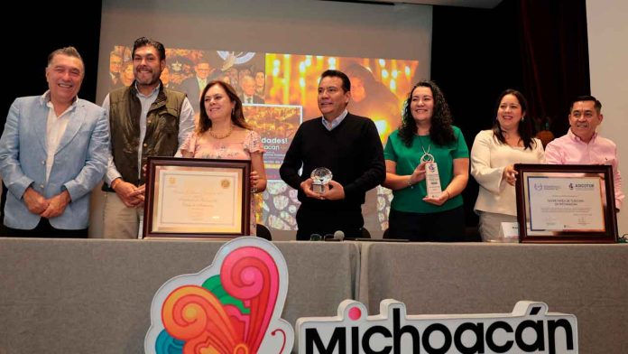 Monroy García estuvo acompañado en esta rueda de prensa por Beatriz Pérez Torres, presidenta de la Asociación de Hoteles y Moteles del Estado de Michoacán (AHMEMAC); Zyanya Guzmán Fuentes, presidenta de la Asociación de Hoteles de Morelia; Leydy León Rocha, presidenta de la Asociación de Agencias de Viajes Mexicana (AAVM) Michoacán; y por Juan Bosco Vega Parrales, director del Festival Internacional de Órgano de Morelia (FIOM) Alfonso Vega Nuñez, quienes mostraron algunos de los reconocimientos que se dieron al estado por la Noche de Muertos y la materia turística que hace la Sectur a través de Roberto Monroy García.