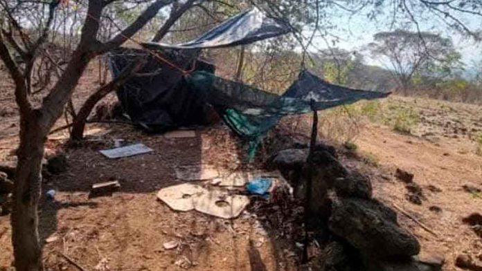 Los elementos del Ejército Mexicano, Guardia Nacional y Guardia Civil se desplegaron en la zona Acahuato, donde al inspeccionar en un área cerril hallaron el campamento ilícito, usado por una célula criminal.