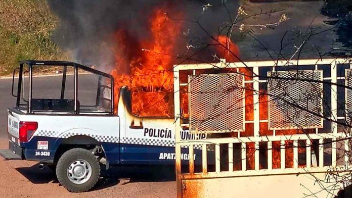 Apatzingán, Mich.- Martes 11 de febrero de 2025.- Un hombre con heridas de bala fue hallado sin vida a un costado de la carretera Apatzingán-Presa del Rosario en el municipio de Apatzingán, lo que movilizó a la Policía Municipal. Sin embargo, mientras los uniformados inspeccionaban la escena, un narcodrón fue lanzado sobre su patrulla, incendiándola por completo.