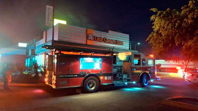 Uruapan, Mich.- 12 de febrero de 2025.- Una intensa movilización por parte de las corporaciones de auxilio y policiales se registró para atender un conato de incendio en la pizzería “Little Caesars”, localizada en la Plaza 500, sobre el Libramiento Oriente de la ciudad de Uruapan, luego un aparente robo.
