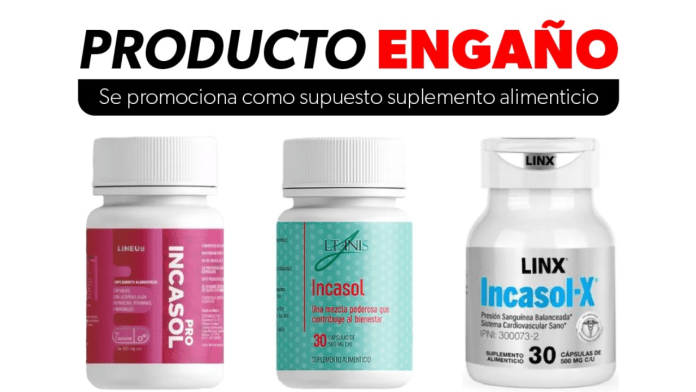 Morelia, Michoacán.- La Comisión Federal para la Protección contra Riesgos Sanitarios (Cofepris) a través de la Secretaría de Salud de Michoacán (SSM), alerta a la población sobre los productos Incasol (LTANIS), Incasol-X (LINX) e Incasol Pro (LINEUS), los cuales se promocionan como suplementos alimenticios, y en su publicidad aseguran propiedades terapéuticas para el sistema cardiovascular, sin contar con respaldo científico ni autorización sanitaria.
