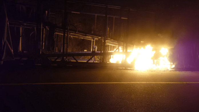 Mientras que en el kilómetro 250 del tramo Las Cañas – Feliciano, el chofer de un tráiler nodriza (vacío), se percató que de las llantas traseras de su remolque ardían en llamas, por lo que se detuvo y desenganchó el resto de su unidad.