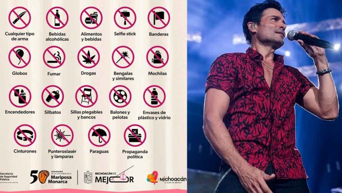 Morelia, Michoacán, 18 de febrero de 2025.- Para que disfrutes en un ambiente 100 por ciento familiar del concierto gratuito de Chayanne, organizado por el Gobierno de Michoacán como parte del Festival Jalo, la Secretaría de Seguridad Pública (SSP) da a conocer los objetos que no podrás ingresar al Estadio Morelos.
