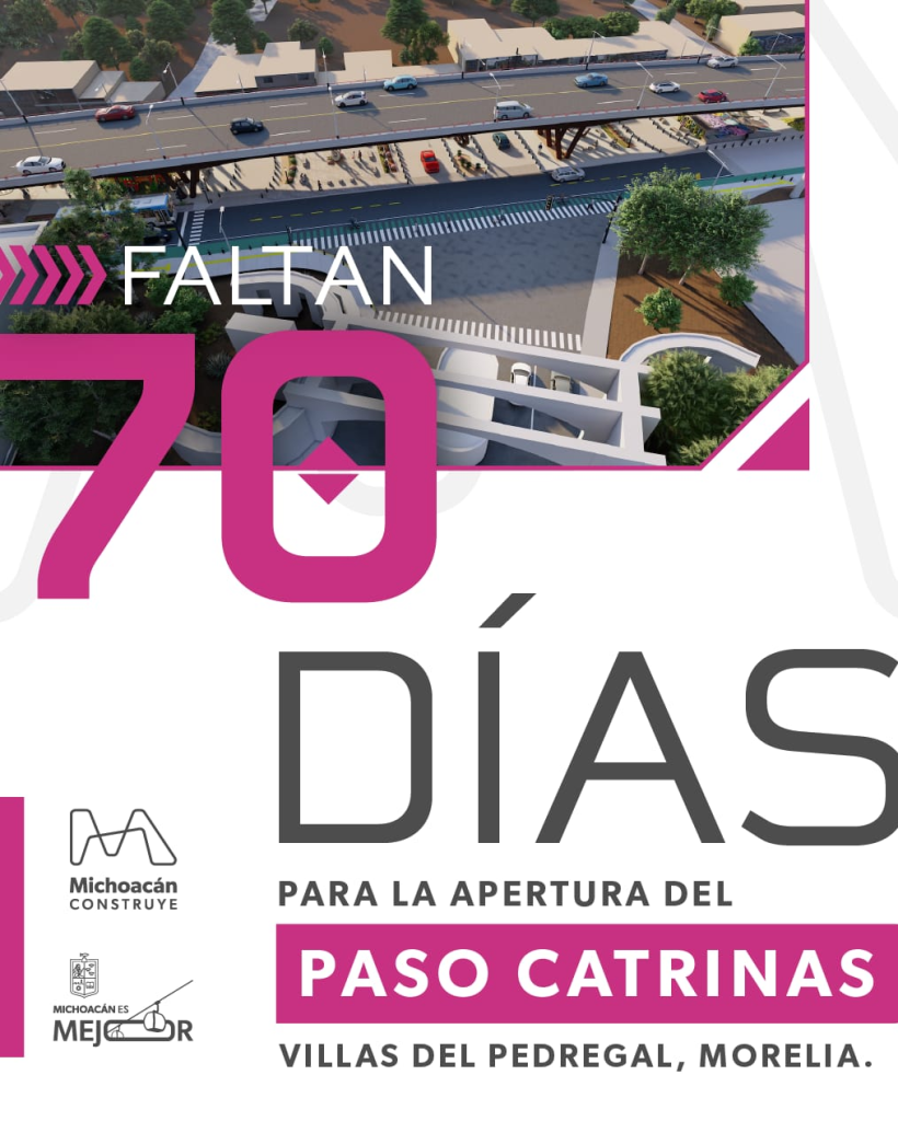 Morelia, Michoacán, 19 de febrero de 2025.- Faltan sólo 70 días para abrir a la circulación el paso superior vehicular de Villas del Pedregal en Morelia, construcción que registra actualmente un avance del 82 por ciento, informó el gobernador Alfredo Ramírez Bedolla.