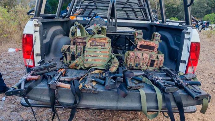 Los detenidos se encontraban en posesión de 23 kilos 640 gramos de marihuana, siete armas de fuego largas, 15 cargadores, 386 cartuchos útiles, cuatro chalecos tácticos con la leyenda de un grupo delictivo, cuatro teléfonos celulares y tres vehículos.