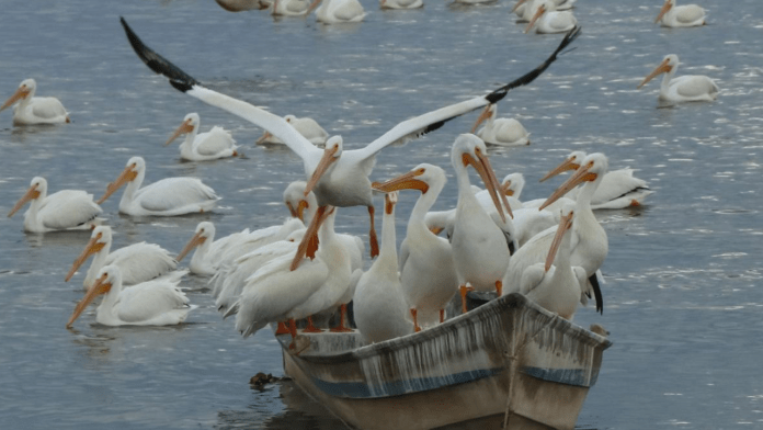 Cojumatlán, Michoacán.- La isla de Petatán, en el municipio de Cojumatlán, vuelve a pintarse de blanco con la llegada de cerca de 23 mil ejemplares de pelícano borregón. Estas aves migratorias provenientes del sur de Canadá, norte de Estados Unidos y Groenlandia buscan refugio en el lago de Chapala para resguardarse del invierno.