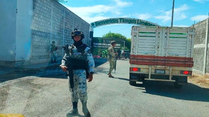 Apatzingán, Michoacán, 24 de febrero del 2025.- Elementos de las secretarías de Seguridad Pública (SSP), y de la Defensa Nacional (Defensa), realizan diversos operativos en el Tianguis Limonero y en sus inmediaciones para garantizar el orden público en los procesos productivos del sector citrícola.