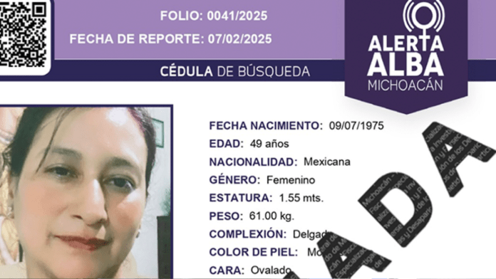 Jiquilpan, Michoacán.- La Fiscalía General del Estado de Michoacán (FGE) desactivó Alerta Alba de una mujer de 49 años de edad, quien el pasado 7 de febrero fue reportada como desaparecida, en el municipio de Jiquilpan.
