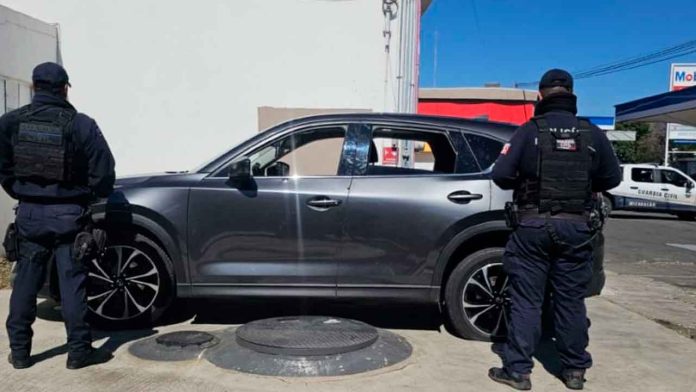 Al inspeccionar el automotor de la marca Mazda, color gris, los elementos de la Guardia Civil detectaron que presentaba varios impactos por proyectil de arma de fuego, mientras que al revisar sus antecedentes, se confirmó que tiene reporte de robo.
