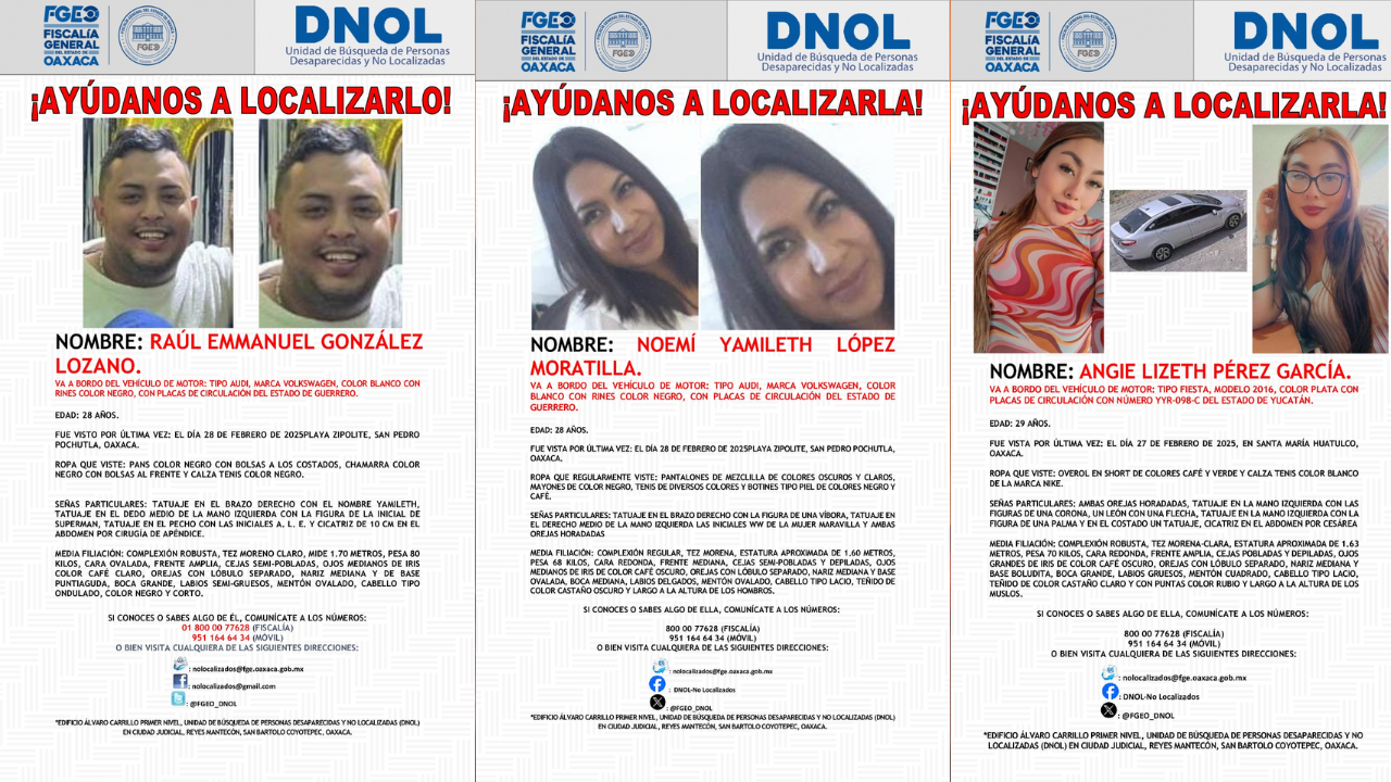 En tanto que, Raúl Emmanuel González Lozano y Noemí Yamileth López Moratilla, fueron vistos por última vez el 28 de febrero de 2025, en la playa de Zipolite.