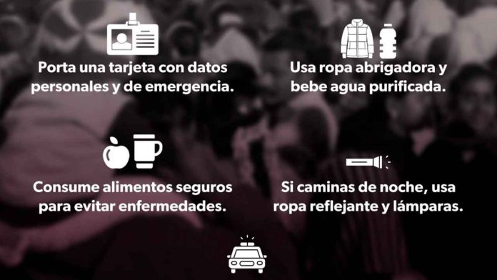 Se emiten esta lista de recomienda a cada peregrino: portar una tarjeta de identificación con datos personales y números de contacto en caso de emergencia, consumir alimentos seguros, llevar sombrilla o gorra, mantenerse abrigados durante la noche y beber agua purificada para prevenir riesgos.