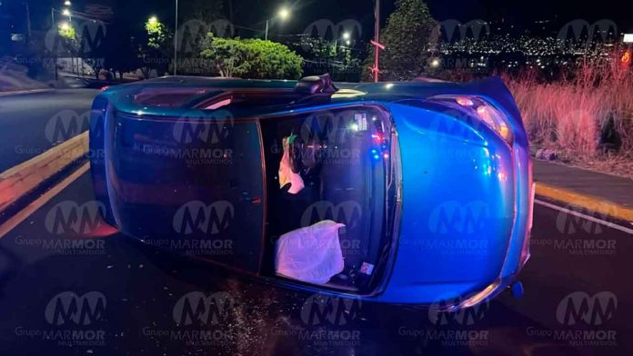 Morelia, Mich.- Viernes 07 de marzo de 2025.- Un automóvil volcó en una de las rampas para acceder del libramiento a la Calzada La Huerta y viceversa, hecho que ocurrió la noche de este viernes cerca de los fraccionamientos La Huerta y Morelia 450.