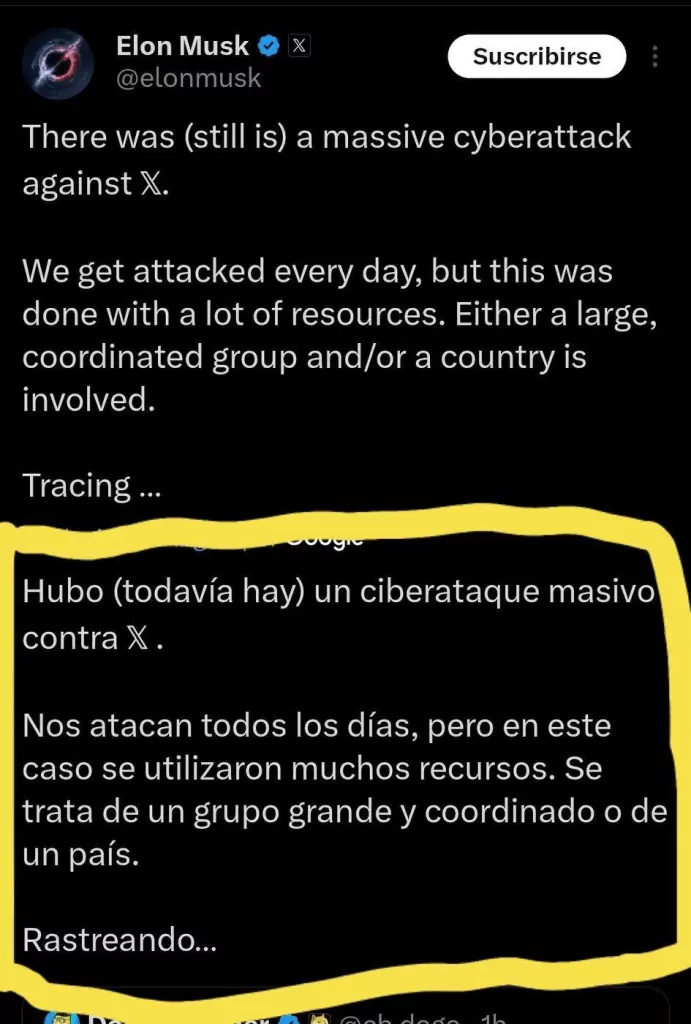“Hubo (todavía hay) un ciberataque masivo contra X. Nos atacan todos los días, pero esto se hizo con muchos recursos. O está involucrado un grupo grande y coordinado y/o un país”, aseguró el propietario de la red social afectada, Elon Musk.