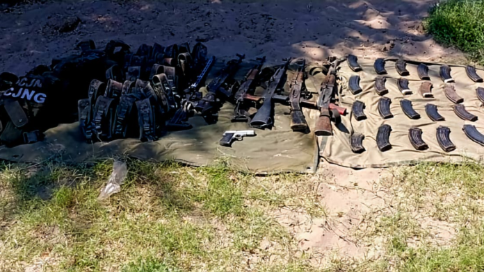 Apatzingán, Mich.- 12 de marzo de 2025.- Una célula del Cartel Jalisco Nueva Generación se enfrentó a balazos en contra de personal del Ejército Mexicano, Guardia Civil y Guardia Nacional, en una zona cerril del municipio de Apatzingán, con saldo de un presunto gatillero abatido y 4 detenidos, así como armamento y equipo táctico asegurado.