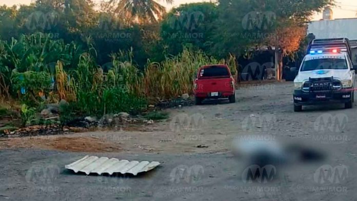 Coahuayana, Mich.- 14 de marzo de 2025.- Criminales abandonaron un cadáver decapitado y envuelto en plástico transparente de un sujeto desconocido frente al empaque Asociación Plátanos Machos y Bananos A.C., en esta demarcación de Coahuayana.