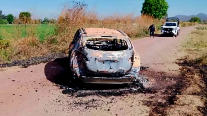 Álvaro Obregón, Mich.- 15 de marzo de 2025.- Oficiales de la Policía Municipal que realizaban patrullajes en una brecha de Álvaro Obregón localizaron totalmente calcinado un vehículo baleado, en la zona se aseguraron decenas de casquillos percutidos para arma larga.