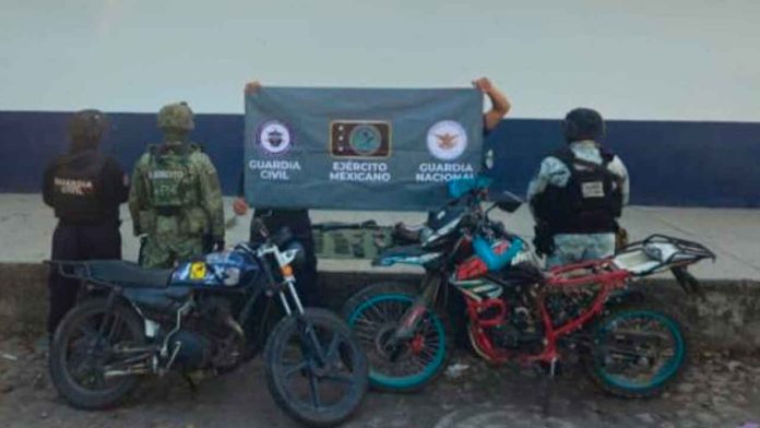 En el lugar también se decomisó una motocicleta de la marca Italika, de modelo reciente que cuenta con reporte de robo, y una más de la misma marca, sin placas de circulación.
