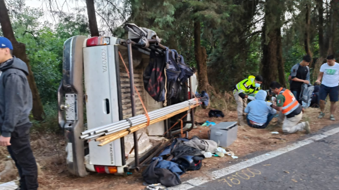Peribán, Mich.- 21 de marzo de 2025.- Doce integrantes de una cuadrilla de cortadores de aguacate de la ciudad de Los Reyes resultaron lesionados, cuatro de ellos de consideración, luego de que el chófer de la camioneta en la que viajaban a trabajar a una huerta del municipio de Peribán, chocará contra un camión de carga cuando intentaba rebasarlo y luego volcara quedando la unidad fuera de la cinta asfáltica y los jóvenes regados en el suelo.