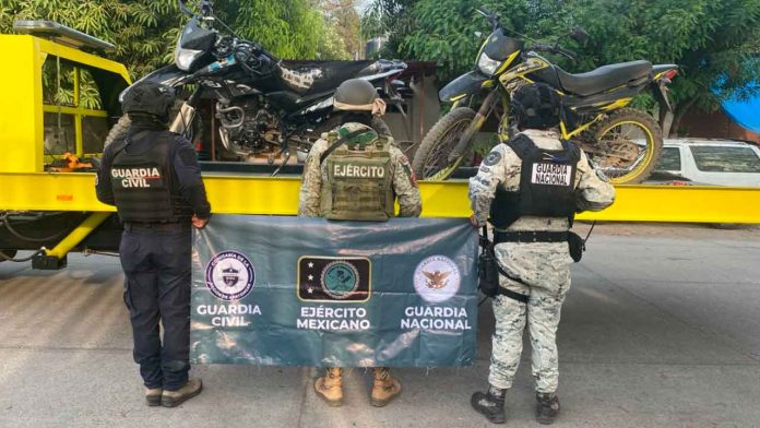 La acción operativa se desarrolló en un camino de terracería cerca de la localidad de Puertecitos, municipio de Apatzingán; ahí los uniformados localizaron tres armas, dos tipo fusil y una corta; también encontraron dos chalecos porta placas, así como un vehículo de la marca Kia y dos motocicletas Italikas, todos con reporte de robo.