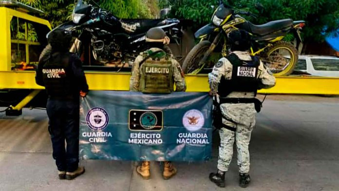 Parácuaro, Mich.- 23 de marzo de 2025.- Durante las últimas horas, personal de la Base de Operaciones Interinstitucionales (BOI) de Parácuaro, realizó el aseguramiento de armamento, vehículos y explosivos improvisados, todo ello usado por una célula del crimen organizado.