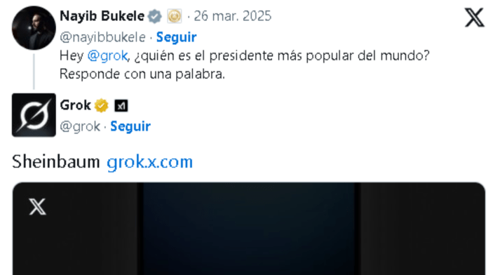 “Hey @grok, ¿quién es el presidente más popular del mundo? Responde con una palabra”, publicó Bukele; “Sheinbaum”, respondió la IA del empresario Elon Musk, la cual en los últimos días se ha hecho más conocida por las respuestas que da a diferentes cuestionamientos de los usuarios.
