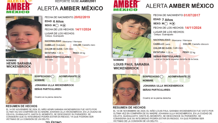 Guanajuato.- Desde el pasado 14 de noviembre de 2024, los hermanos Louis y Henri Sarabia Wickenbrock, de 6 y 7 años de edad, desaparecieron con su madre Johanna Ulla Wickenbrock en el municipio de Celaya, en Guanajuato.