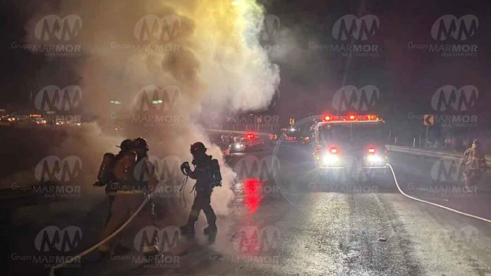 Fue la noche de este sábado, cuando las corporaciones de auxilio recibieron el reporte de que un vehículo ardía en llamas a la salida de uno de los túneles en dicha vialidad, movilizando a los oficiales de Seguridad Vial de Guardia Civil, quienes de inmediato abanderaron el área para evitar algún accidente.