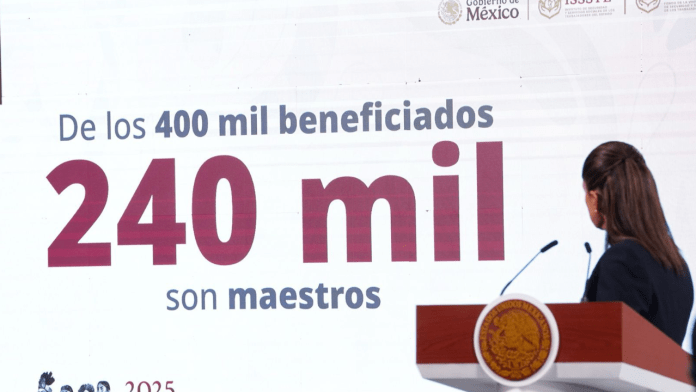 La Presidenta de México firmó el Decreto a través del cual se beneficiarán a 400 mil trabajadores del Estado —de los cuales 240 mil son maestros y maestras—, con créditos impagables del Fondo para la Vivienda del Instituto de Seguridad y Servicios Sociales de los Trabajadores del Estado (FOVISSSTE) a quienes se les otorgarán congelamientos; quitas; reducción de intereses y condonaciones de saldos.