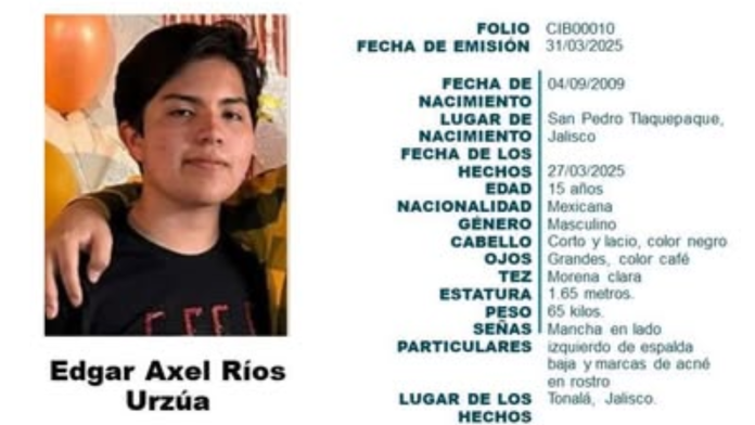 Jalisco.- Axel Ríos, un joven de 15 años de edad, desapareció el pasado jueves 27 de marzo, tras salir de clases del Politécnico de la Universidad de Guadalajara.