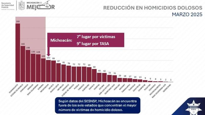 Morelia, Michoacán, 3 de abril del 2025.- El estado de Michoacán se encuentra fuera de los seis estados que concentran el mayor número de homicidios dolosos en el país, según datos del Secretariado Ejecutivo del Sistema Nacional de Seguridad Pública (SESNSP).