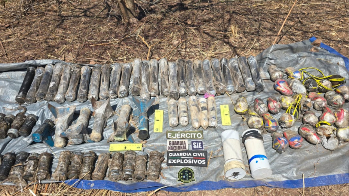 A su vez, se encontró un aproximado de 18 kilos de explosivos, así como seis kilos de pólvora que presuntamente serían utilizados para la elaboración de explosivos improvisados, los cuales fueron desactivados por personal del Agrupamiento Especializado de Artefactos Explosivos y Materiales Peligrosos de la Guardia Civil y equipo especializado del Ejército Mexicano.