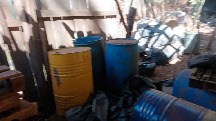 En la comunidad El Pedregal, los agentes de la Guardia Civil localizaron un laboratorio clandestino en el que se encontraron 14 tambos de sustancia granulada con las características propias de la metanfetamina, además de cinco cocinas utilizadas para la elaboración de la misma, y diez tambos más con drogas.