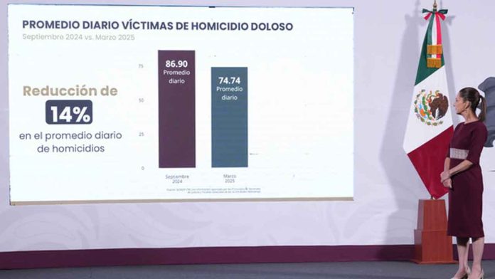 La Presidenta de México, Claudia Sheinbaum Pardo, resaltó que gracias a la Estrategia Nacional de Seguridad, en marzo de 2025 hay 12 homicidios diarios menos en el país que en septiembre de 2024.