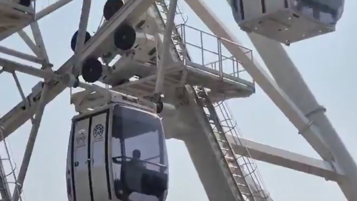A través de redes sociales, el medio de comunicación El Universal compartió imágenes en redes de las personas que quedaron dentro de las cabinas de la rueda de la fortuna, quienes estuvieron suspendidos en las alturas por varios minutos.