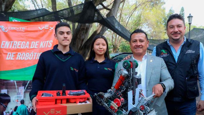 Morelia, Michoacán, 2 de mayo de 2025.- Con el objetivo de fortalecer el desarrollo científico y tecnológico, el secretario de Gobierno, Carlos Torres Piña, entregó equipos Súper Kit V5 y uniformes a la delegación del Colegio de Estudios Científicos y Tecnológicos del Estado de Michoacán (Cecytem), que representará a Michoacán en el Campeonato Mundial de Robótica VEX 2025 en Dallas, Texas.